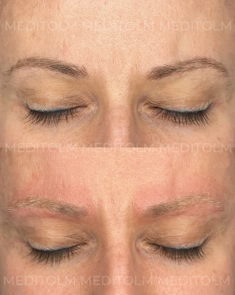 Po lewej – zdjęcie przed zabiegiem i bezpośrednio po laserowem usuwaniu makijażu permanentnego. Usunęliśmy permanent za 1 zabieg.